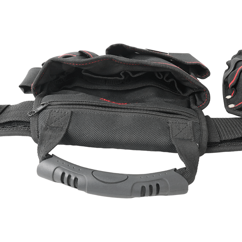 3) على اليمين: خارجي 2 جيوب 4 حاملات ، مشبك شريط قياس ، 4 حاملات داخلية 7 حلقات وجيب بسحاب بمقبض بلاستيكي