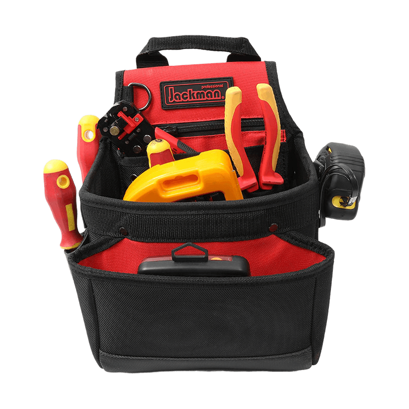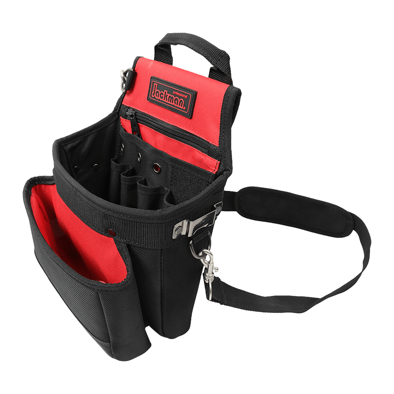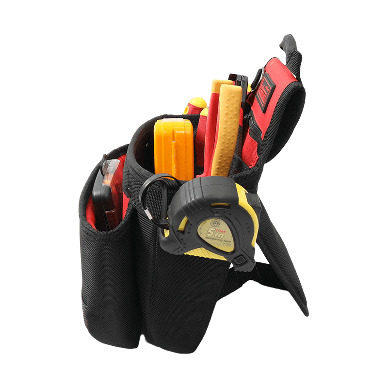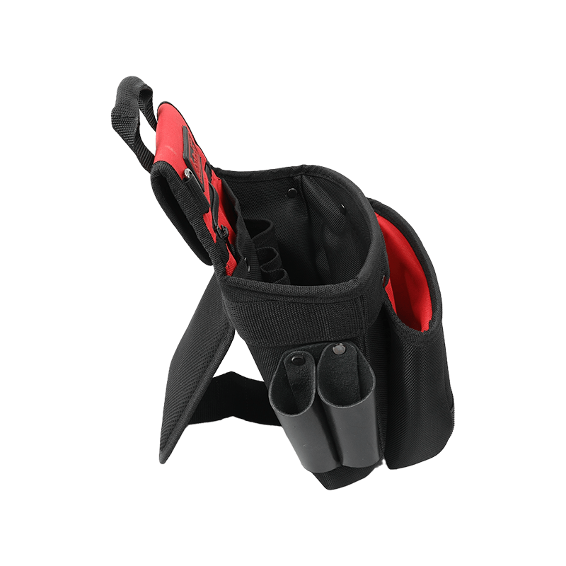 الخصر والكتف والحمل باليد ، ويمكن دعم الظهر عند الوقوف. يوجد جيبان لمفك البراغي الجلديان على اليسار وشريط قياس على اليمين. يوجد جيب بسحاب في الجيب الرئيسي بفتحة كبيرة وأربعة جيوب صغيرة ، أحدها مضاف بلوح PE لوضع السكاكين الحادة. تصميم مقاوم للاهتراء ومقاوم للانزلاق PVC مقاوم للماء في الجزء السفلي من الكيس الخارجي. جيب خلفي شبكي ثلاثي الأبعاد مسامي ومقاوم للعرق